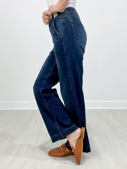 Upgrade your wardrobe with the Ella Grace Hi-Rise Comfort Luxe Wide Leg Jeans. Crafted for the modern woman, these jeans blend timeless style with unparalleled comfort. Designed with a flattering double-button waistband and flowy wide-leg silhouette, they’re perfect for every occasion – from casual brunches to evening outings. Experience confidence like never before!